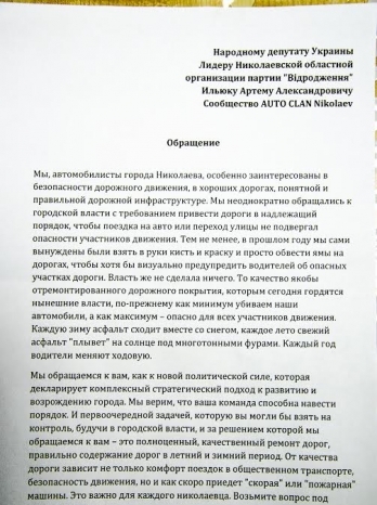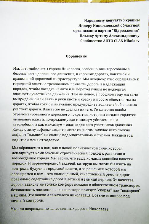Автомобилисты вручили обращение к народному депутату Украины, лидеру Николаевской областной организации партии «Відродження», в котором обратили внимание на качество нынешнего ремонта дорог и его полное отсутствие на многих улицах.
