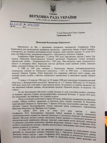 Народные депутаты Украины уже во второй раз обращаются к председателю Верховной Рады Владимиру Гройсману с просьбой присвоить звание Героя Украины погибшему в зоне проведения Антитеррористической операции командиру 73-го Морского центра специального назначения, капитану первого ранга Юрию Олефиренко.