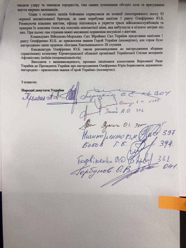 — Полгода назад аналогичные документы с подписью сотни нардепов, председателя Николаевской ОГА Вадима Мерикова и председателя Очаковской РГА Сергея Самоукова поступили в Администрацию Президента. Считаю, что наш долг - довести начатое до реализованного, ведь сомнений нет: Юрий Олефиренко - Герой. Вечная память борцам за независимость Украины, - написал нардеп.