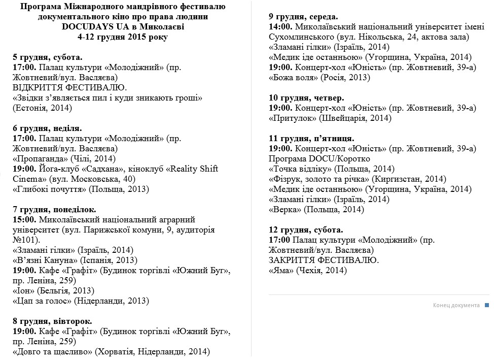 Напомним, что путешествующий фестиваль «Docudays UA» - некоммерческое мероприятие, вход на все сеансы с 5 по 12 декабря в Николаеве бесплатный. Фестиваль проходит при поддержке Николаевской областной государственной администрации. Подробную программу кинопоказов в рамках фестиваля в Николаеве можно посмотреть здесь.
