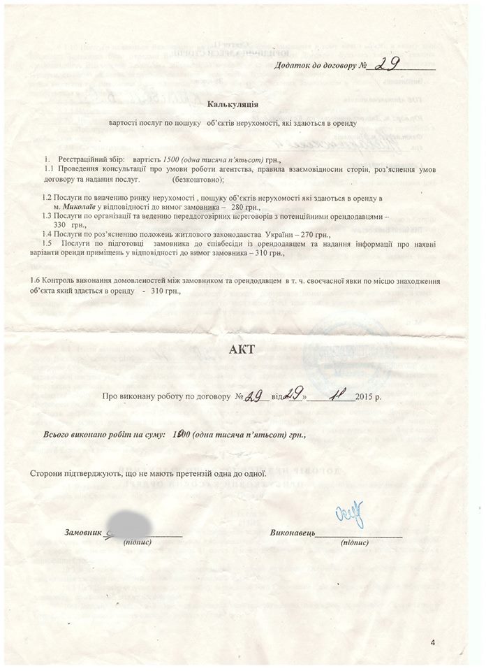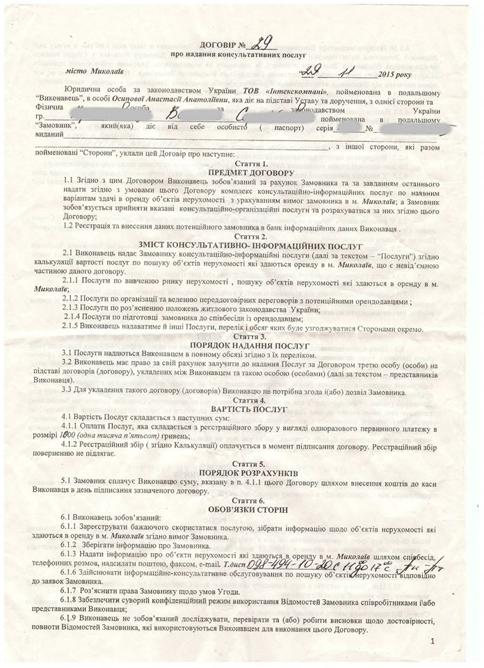 По словам Сисина, боец 29 ноября обратился в агентство ООО «Интекскомпани» с целью найти съемное жилье в Николаеве. Военный оформил договор, согласно которому заплатил 1000 гривен за предоставление информационных услуг.