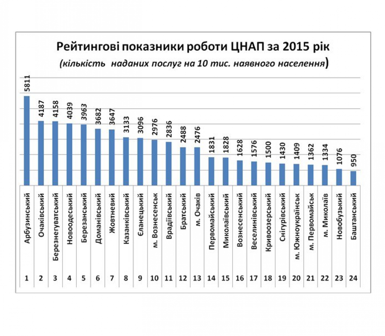 Наименьшее количество услуг в течение 2015 года получено в центрах предоставления административных услуг Новобугского и Баштанского районов. Эти районы заняли 23 и 24 места рейтинга.
