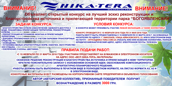 Конкурсные работы принимаются до 31 марта 2016 года на бумажных носителях по адресу: 54052, город Николаев, улица Айвазовского, 23, или в электронном виде на почту – office@nika-tera.com.ua.