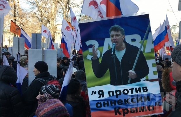 В центре Москвы тысячи людей вышли на Марш памяти российского оппозиционера Бориса Немцова, убитого год назад.
