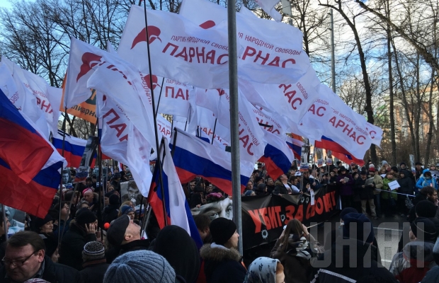 Собравшиеся держат в руках государственные флаги России с черными траурными лентами, а также флаги российских оппозиционных партий ПАРНАС и "Солидарность".