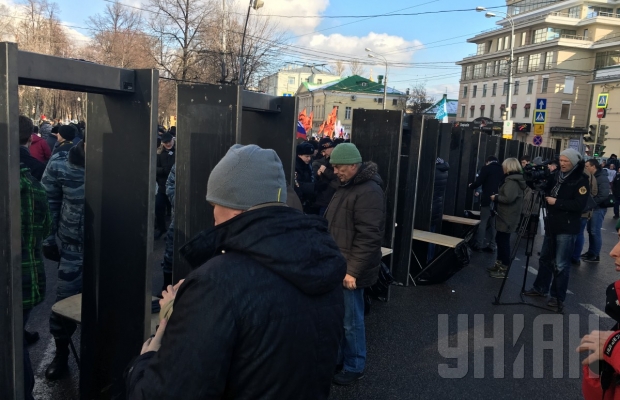 Маршрут проведения акции оцеплен временным металлическим ограждением, проход в это отведенное пространство осуществляется только после контроля полицейскими с помощью металлодетекторов.