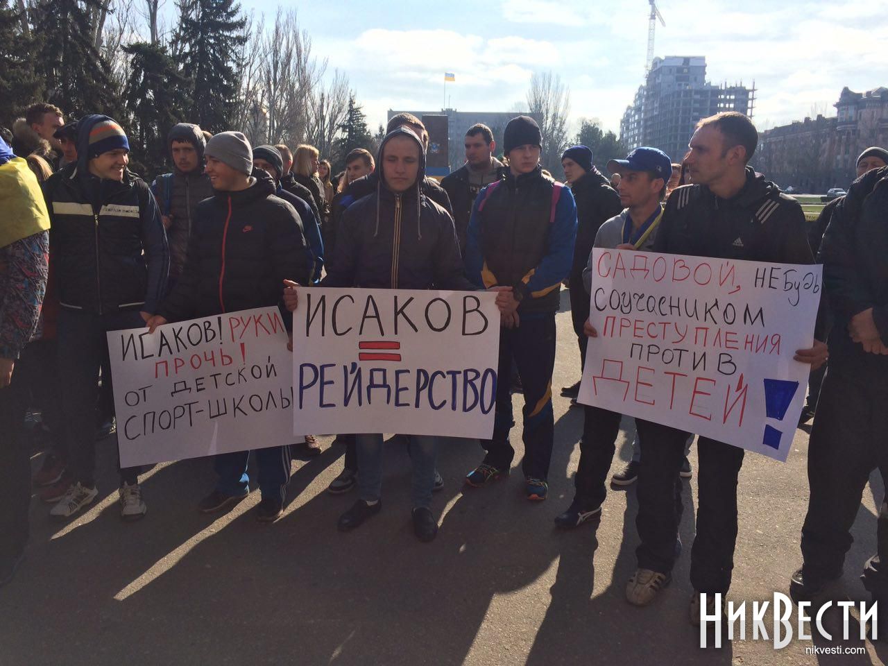 Всего около 80 пикетчиков, они заявили, что депутат Николаевского городского совета от «Самопомощи» Сергей Исаков осуществляет всестороннее давление на ДЮСШ в виде многочисленных проверок и запросов.
