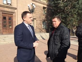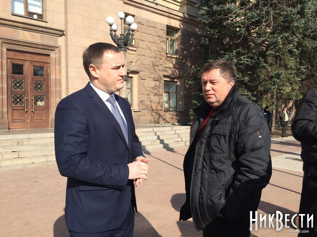 К протестующим вышел заместитель городского головы Евгений Шевченко.