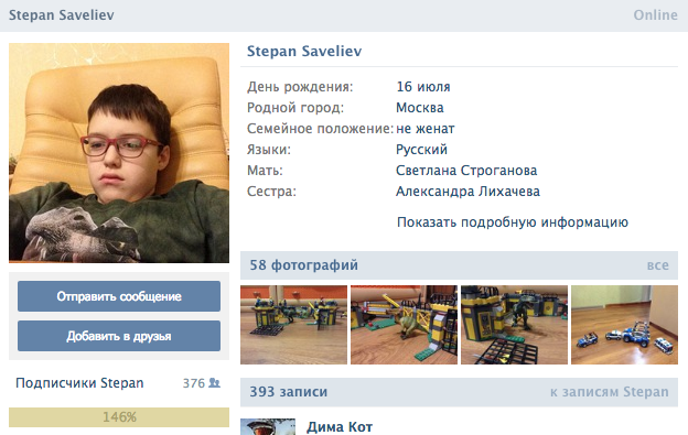 Социальная сеть «ВКонтакте» также поддержала 11-летнего Степана Савельева – под аватаркой Степана появилась золотая шкала с числом «146%» — так раньше обозначался «рейтинг» пользователя, демонстрирующий степень его «крутизны».