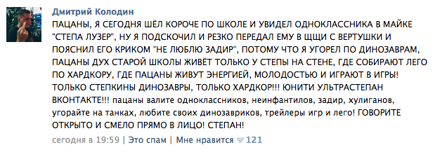 Сегодня в школе его засмеяли одноклассники за его страничку во «ВКонтакте» — мол, он там как маленький ребёнок выкладывает динозавров, танки и какие-то трейлеры игр своих.