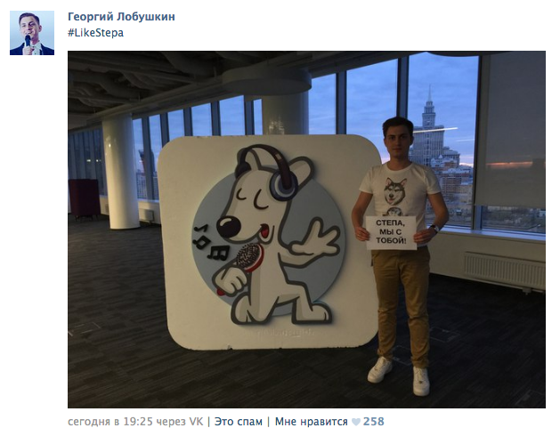 Бывший пресс-секретарь «ВКонтакте» Георгий Лобушкин не только добавил Степана в друзья и поддержал акцию, но и опубликовал фото с плакатом «СТЁПА, МЫ С ТОБОЙ!» на его странице.