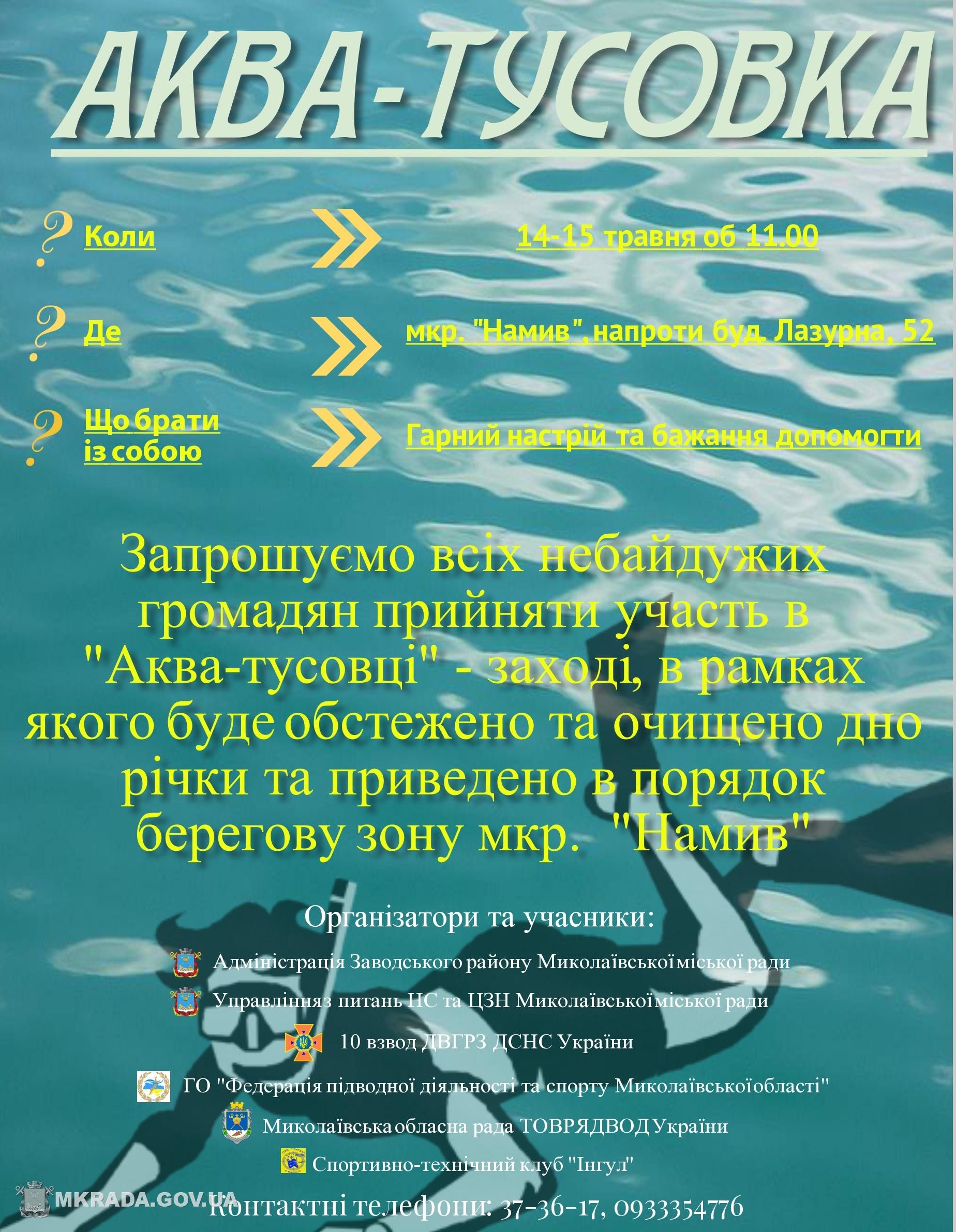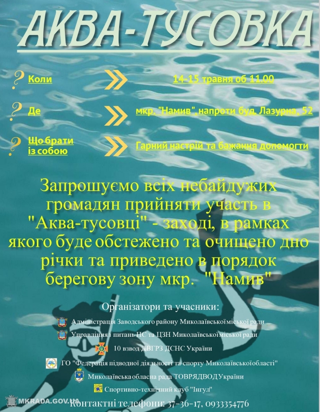 В связи с подготовкой мест отдыха и пляжей к началу купального сезона 2016 года и принятием мер по предупреждению гибели людей на воде администрация Заводского района и управление по вопросам чрезвычайных ситуаций и гражданской защиты населения Николаевского городского совета проведут мероприятие «Аква-тусовка», в ходе которого аквалангисты 10 взвода ДВГРЗ ДСНС Украины, общественные организации «Федерация подводной деятельности и спорта Николаевской области», ТОВРЯДВОД Украины и СТК «Ингул» обследуют и очистят участок дна реки напротив дома №52 по улице Лазурной в микрорайне Намыв.