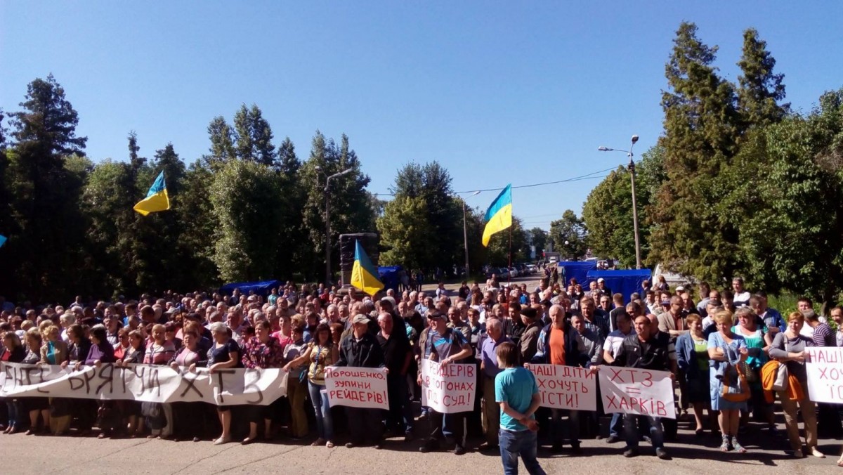 Участники митинга стоят с украинскими флагами, держат в руках плакаты: «Порошенко, останови рейдерство», «Президент, спаси ХТЗ», «Наши дети хотят есть», «ХТЗ ждет губернатора».
