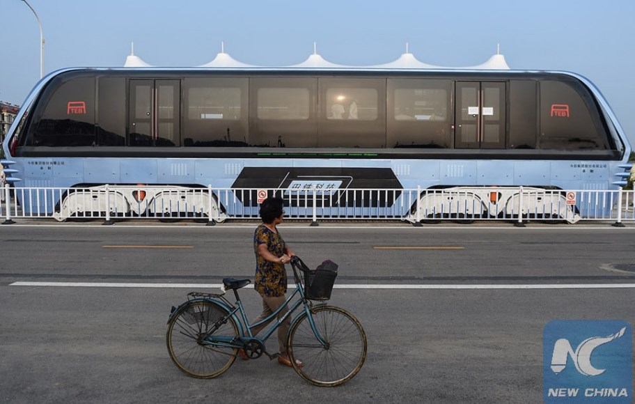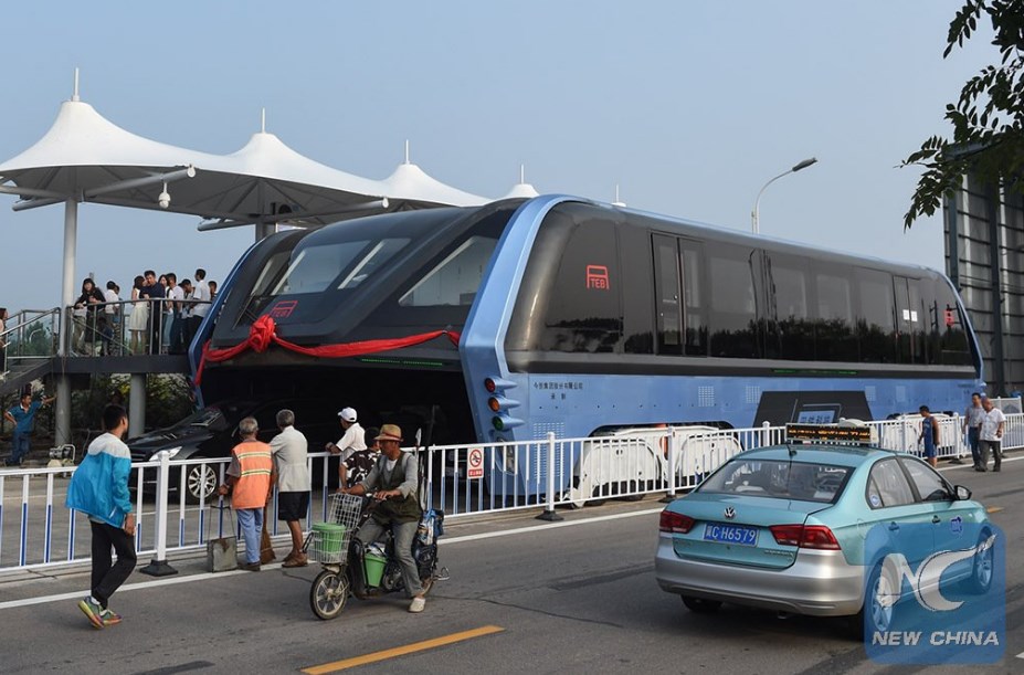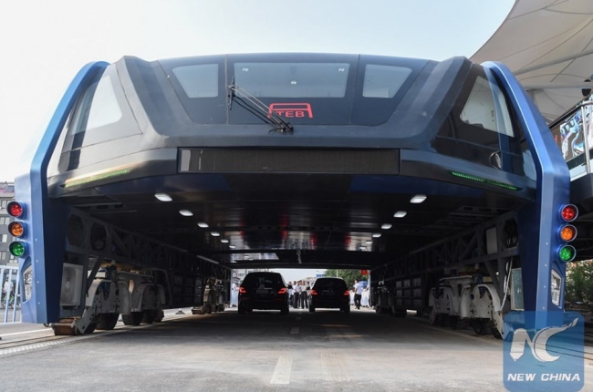 В Китае протестировали "автобус будущего" ТЕВ-1, позволяющий автомобилям проезжать под ним.