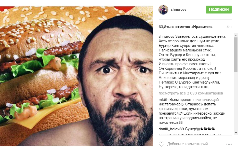 Стихотворение со строками «Бургер Кинг, промокод не однажды доводил до икот тех, кто слабже» было опубликовано 1 августа и собрало более 50 тысяч лайков в соцсети. В минувшую пятницу представители сети ресторанов объявили о готовящемся иске.