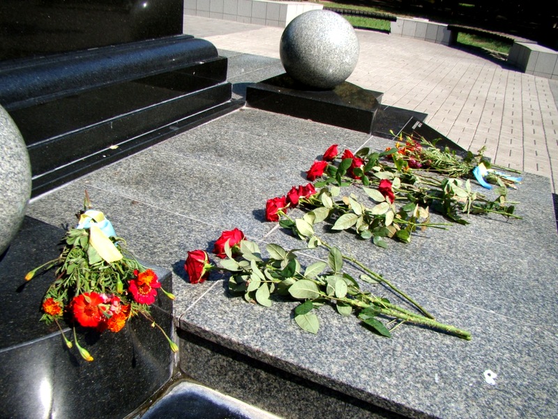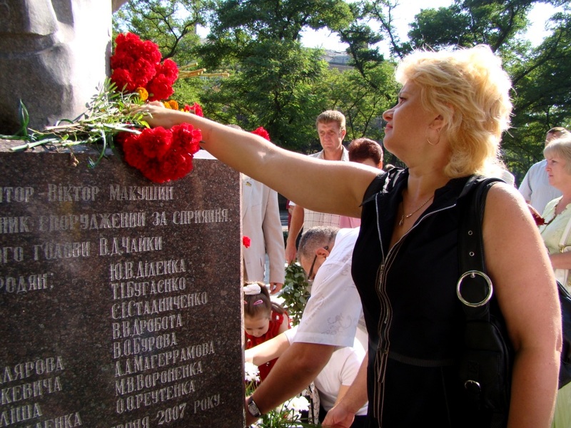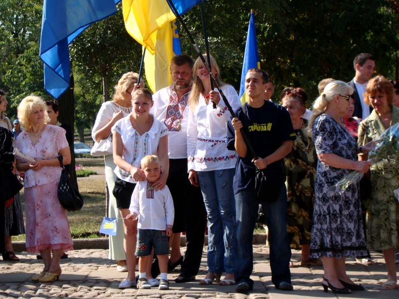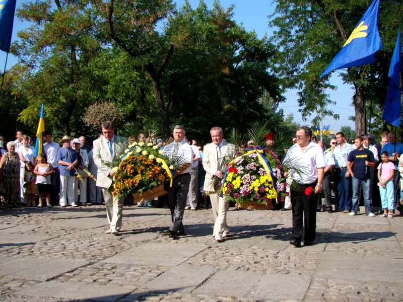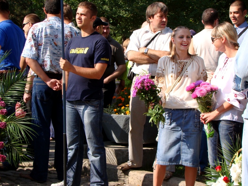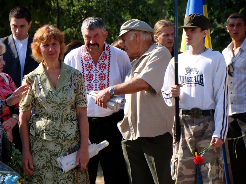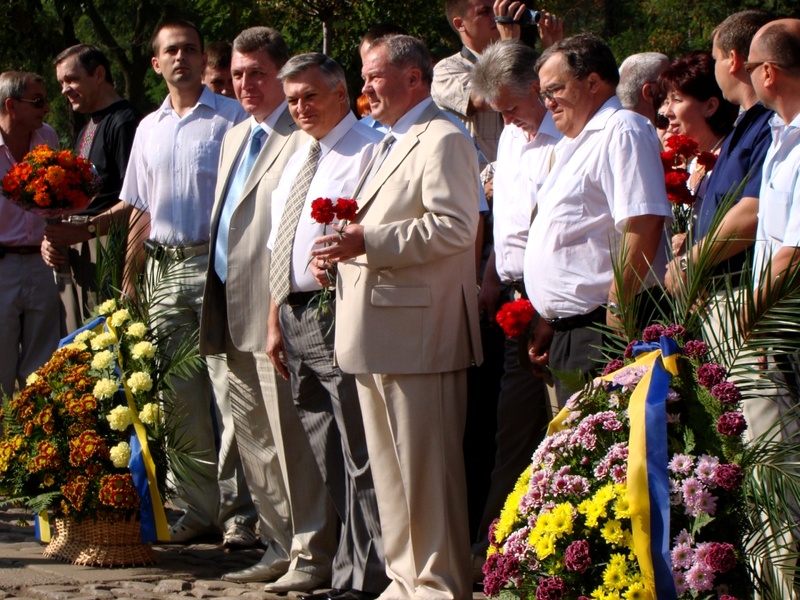 Когда главы города и области подходили к памятнику, женский голос крикнул: «Слава Україні!». Ему ответили немногочисленные голоса: «Героям слава!».
