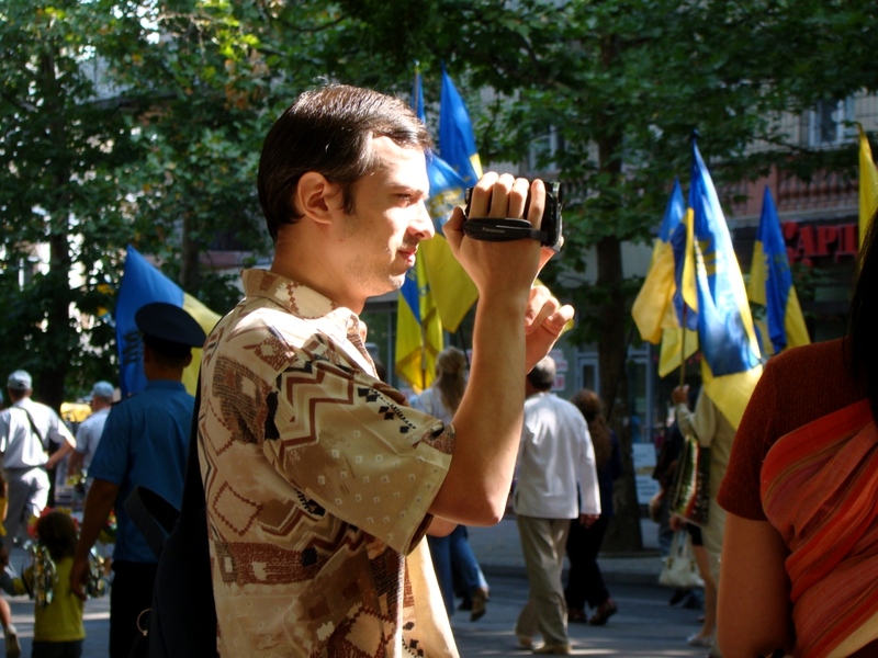 Когда колонна подошла ближе к нему, а фотоаппарат журналиста «нацелился» на мужчину, тот поспешил запрятаться за группой женщин, которые стояли рядом и наблюдали за происходящим. Оппозиционер продолжал «бубнеть» за спинами женщин и бросать злобные взгляды на людей с флагами Украины.