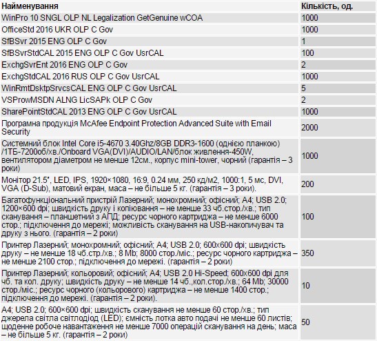 Так, ООО «Валтек» поставит по 10,99 миллионов гривен тысячу системных блоков Intel Core i5-4670 с 8 ГБ оперативной памяти и жестким диском на 1 ТБ по 10 992 грн./шт. Также у фирмы за 653 тысяч гривен купят 200 мониторов диагональю 21.5" по 3 265 грн./шт. Таким образом, компьютер с монитором будет стоить 14 257 гривен.