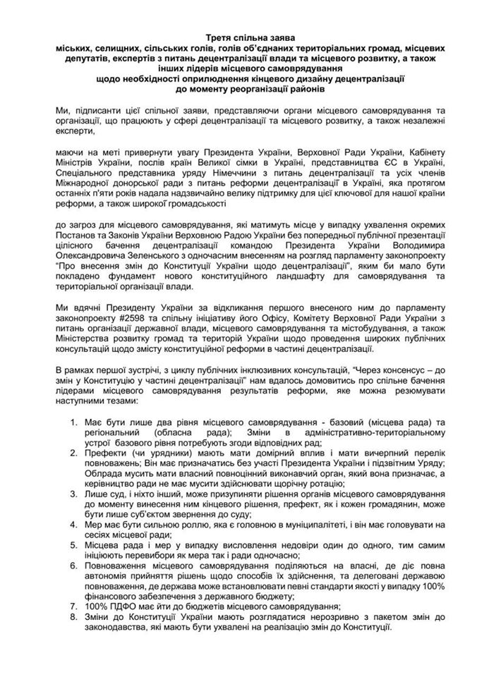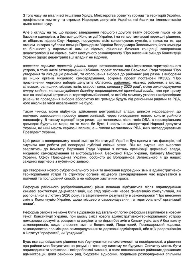 В открытом письме лидеры местного самоуправления просят народных депутатов отклонить проект постановления, предложенный Кабинетом Министров Украины, «О создании и ликвидации районов», а также проект постановления № 3582 «О назначении очередных выборов депутатов областных, районных, городских, районных в городах, сельских, поселковых, городских голов, старост сел, поселков в 2020 году» и отправить их на доработку.