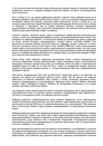 «Любое ответственное решение должно основываться на системности и последовательности, а решение о районах должно базироваться на понимании того, какую систему мы строим. Сначала должны быть обнародованы и зафиксированы все проблемные вопросы, а именно полномочия районных государственных администраций, судьба районных советов, бюджетные отношения, дальнейшее распоряжение общим коммунальным имуществом территориальных общин и государственным имуществом, которое у них на балансе и т. д., а только потом должны принимать технические решения для выполнения концепции», — утверждают авторы заявления.