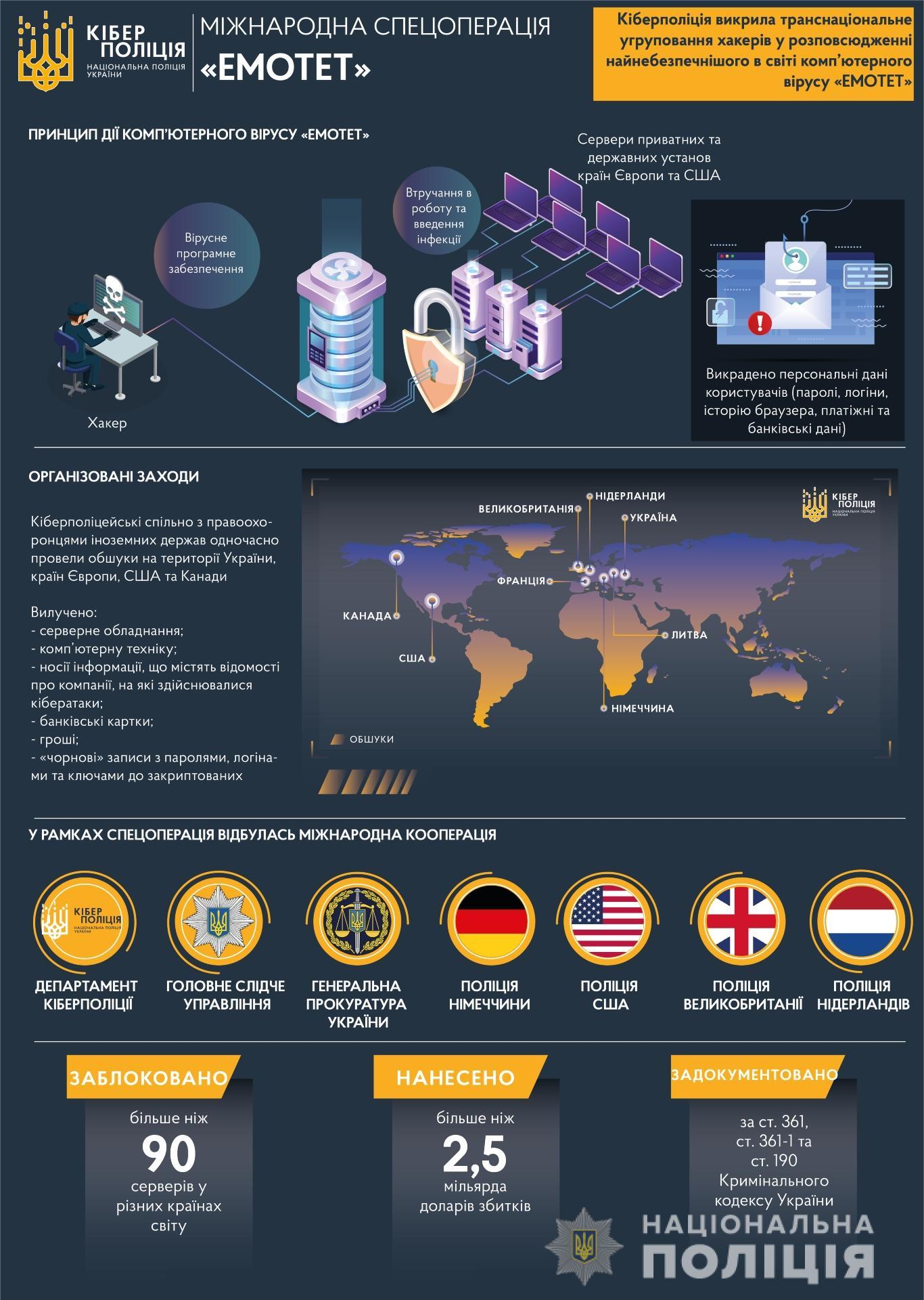 Киберполиция Украины совместно с правоохранителями из других стран разоблачила и заблокировала деятельность международной хакерской группировки, распространявшей вредоносное программное обеспечение. С его помощью хакеры нанесли значительный финансовый ущерб учреждениям из США и стран Европы.