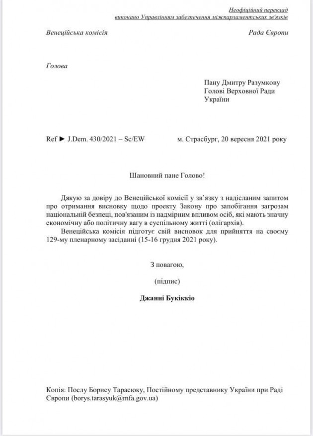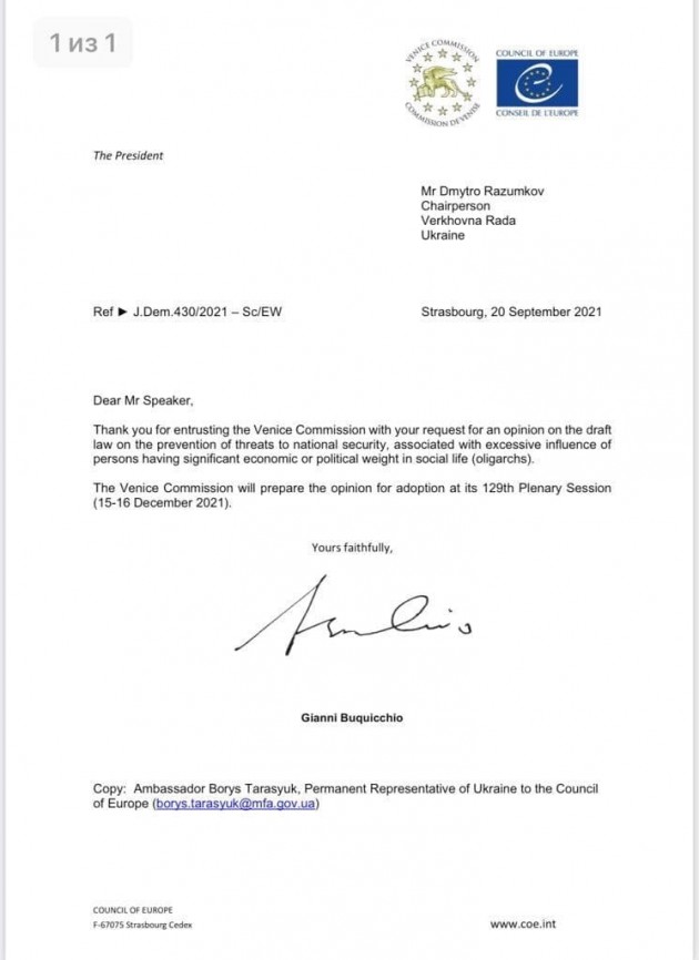 Ранее сообщалось, Венецианская комиссия даст оценку законопроекту об олигархах.
