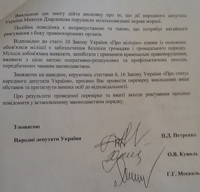 Проверка проводится ввиду обращения народных депутатов Геннадия Москаля, Александры Кужель и Павла Петренко к министру МВД Виталию Захарченко с просьбой обратить внимание на выполнение норм депутатской этики в деятельности нардепа от КПУ Николая Дзарданова.