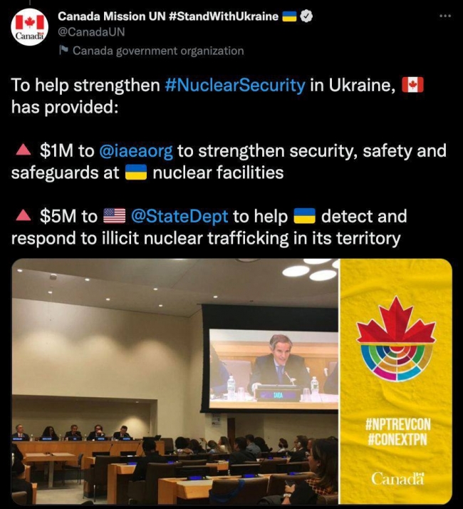 — Аби допомогти підвищити ядерну безпеку в Україні, Канада виділила 1 мільйонів доларів МАГАТЕ для зміцнення безпеки на українських ядерних об’єктах. Також 5 мільйонів доларів Держдепу США для допомоги Україні у виявленні та реагуванні на незаконні ядерні транспортування на її території, — заявили у канадському представництві.
