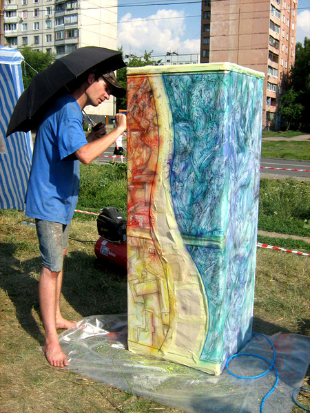 Кроме стен, удалось разрисовать и холодильник. "Это своеобразный художественный перформанс", - пояснил Ю. Яшунин. Возможность стать райтером была предоставлена и журналистам. По обещаниям организаторов, салтовское граффити будет украшать стены около трех лет.