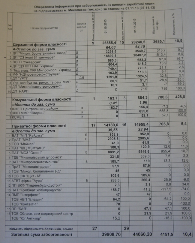 По причине низкого уровня оплаты труда за сентябрь текущего года увеличились суммы долга по зарплате в ГП «Николаевский бронетанковый завод» - на 313,2 тысяч гривен, АТВТ фирма «Аура» - на 67 тысяч гривен, ПМП «Интерфлот» - на 49 тысяч гривен, ДЗ ИИПТ – на 13,9 тысяч гривен, ГП «Судостроительный завод им. 61 коммунара» -  на 1513,4 тысячи гривен, на ПАТ «Николаевский судостроительный завод «Океан» - на 973,6 тысяч гривен и т.д.