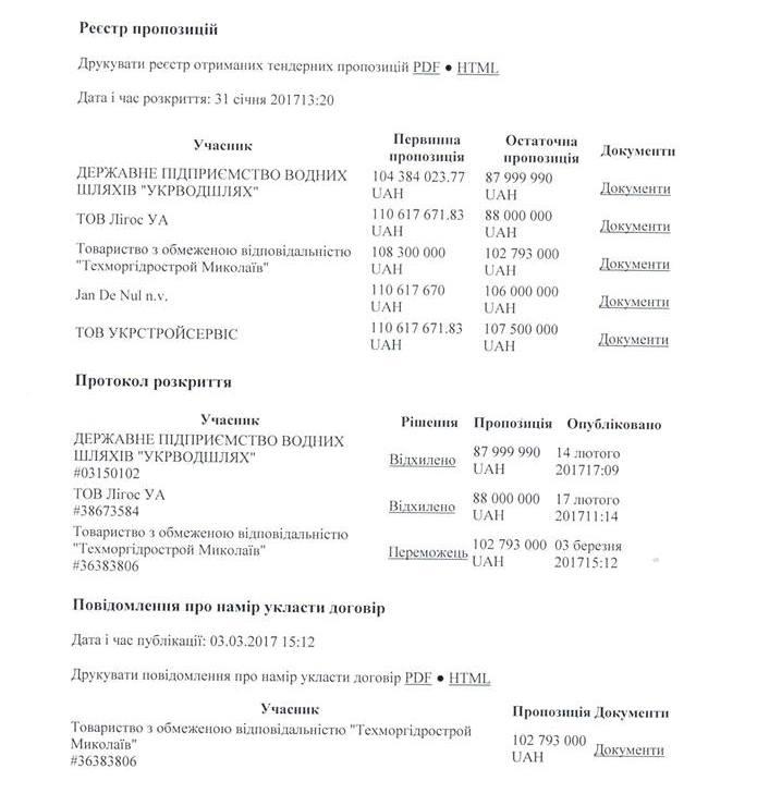 В электронной системе «Prozorro» есть все необходимые документы по тендеру, поэтому можно сделать анализ документов, представленных на торги и доказать, что ООО «Техморгидрострой Николаев» стало победителем исключительно по воле руководства порта. Судите сами.