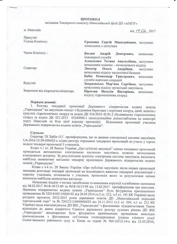 Из протокола заседания тендерного комитета НФ ГП «АМПУ» от 14.02.2017г. видно, что одной из причин отказа от тендерного предложения «Укрводшляха», которое, кстати, ранее выполняло работы по дноуглублению в порту, стало то, что указанное предприятие было в 2012 и 2014 годах фигурантом уголовных производств, которые, скорее всего, на сегодня лопнули как мыльный пузырь.