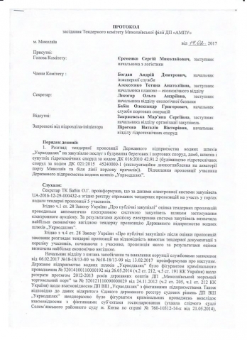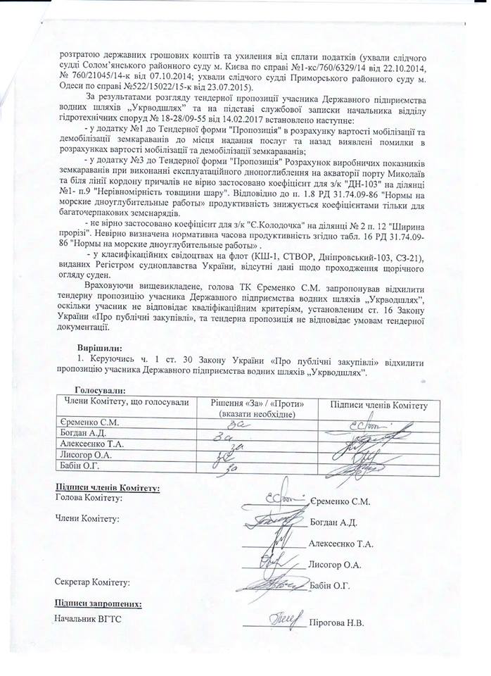 Об этом, а также о том, что в конце 2016 года счета ООО «Техморгидрострой Николаев» были арестованы, не могли не знать руководители НФ ГП «АМПУ» — Козонак В.Н., Пинькас В.Г. и Еременко С.Н.. Но тем не менее, об этом на заседании тендерного комитета порта они умолчали.
