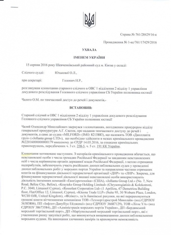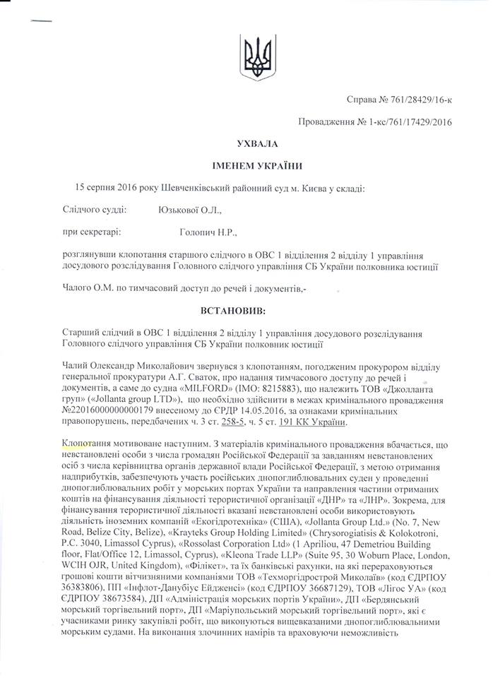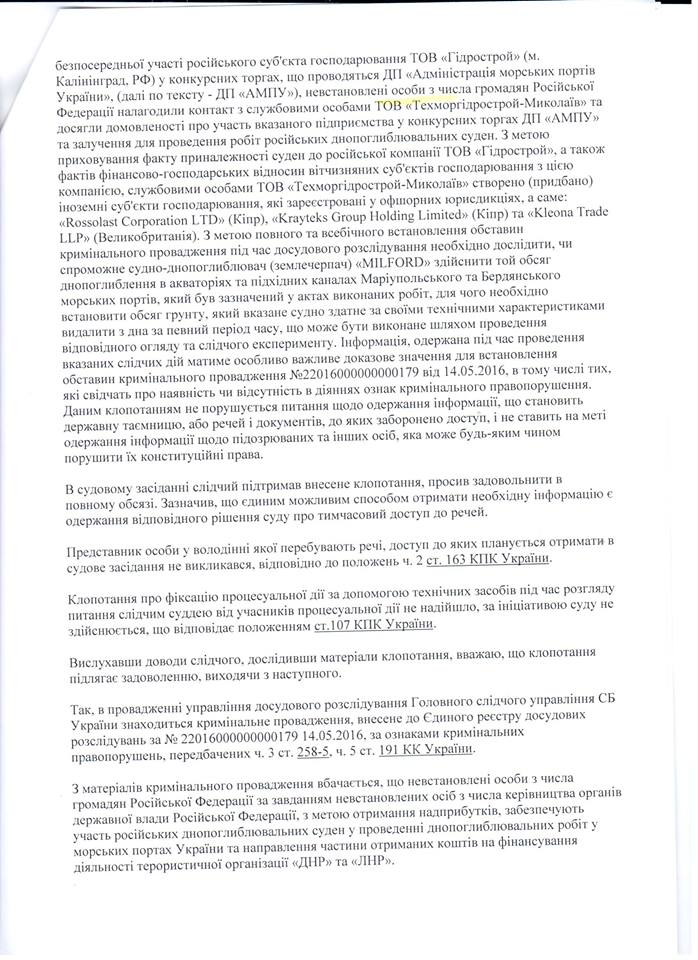 Как указано в решении Шевченковского районного суда г. Киева от 15.08.2016г., неустановленные лица из числа граждан РФ по заданию лиц из числа органов государственной власти РФ, с целью получения сверхприбыли, обеспечивают участие российских дноуглубительных суден в проведении дноуглубительных работ в морских портах Украины и направление части полученных средств на финансирование деятельности террористических организаций «ДНР» и «ЛНР».