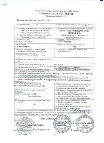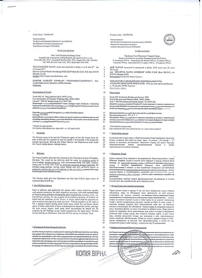 Так, директор ООО «Техморгидрострой Николаев» Буштрук О.Г. «смог» в один день — 26.01.2017г., подписать тайм-чартеры на баржу «МС-34» и буксир «МАРС», находясь в Дубай (ОАЭ) и, одновременно — универсальный тайм-чартер на плавучий кран «КПЛ-99», находясь в Одессе. Сколько ж нужно иметь Буштруков, чтобы успеть преодолеть подобные расстояния?