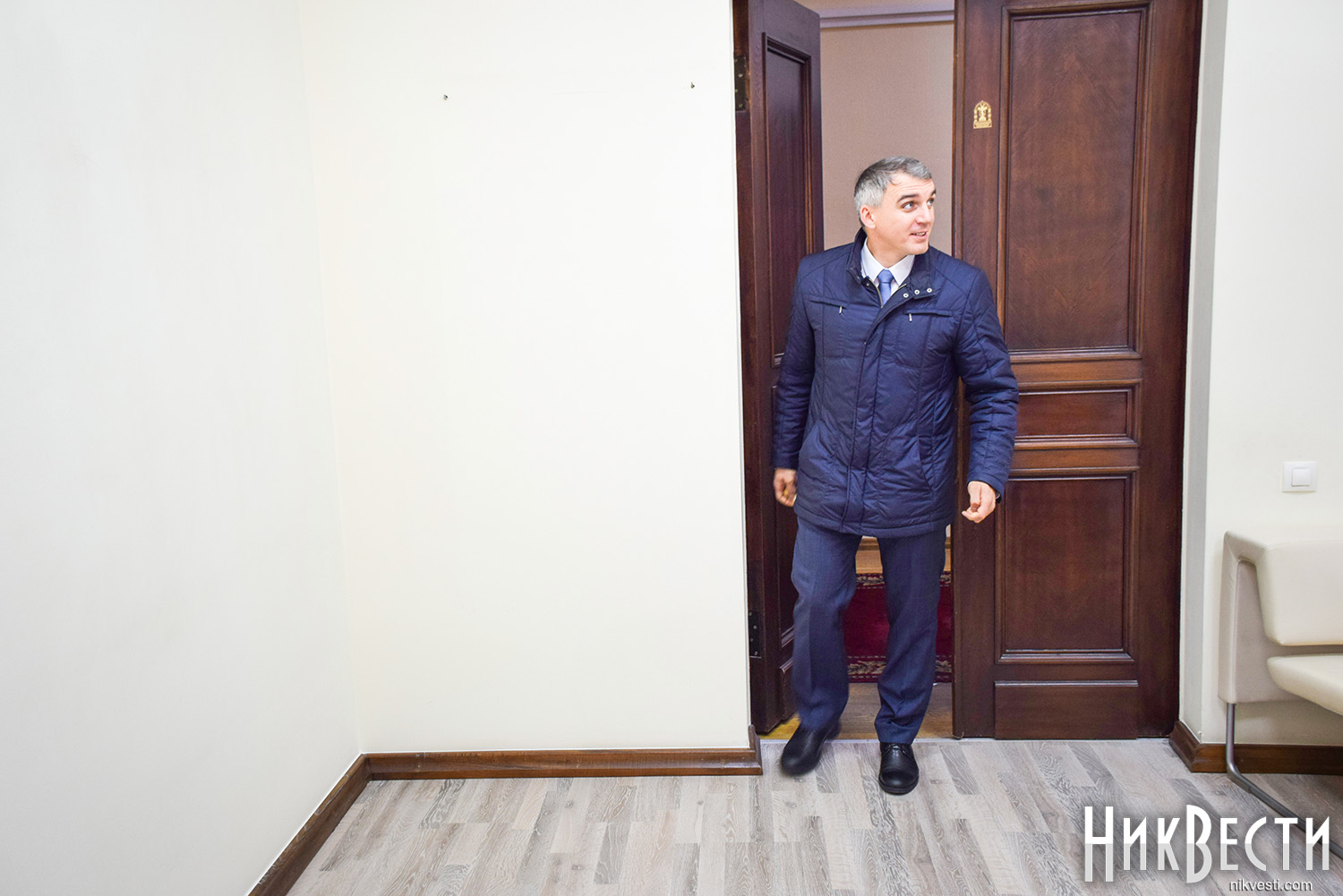 Сегодня утром, сразу после оглашения решения Центрального райсуда Николаева о немедленном восстановлении Александра Сенкевича в должности, он отправился в городской совет со всеми документами, необходимыми для оформления его в должности городского головы Николаева. Уладив дела с документами, мэр получил ключи от своего кабинета, который, как он сам признался немного изменился с момента его последнего визита в октябре прошлого года - оттуда пропала практически вся мебель, а на стенах появились иллюстрации проектов, которые районные администрации и Департамент ЖКХ планируют реализовать в этом году.