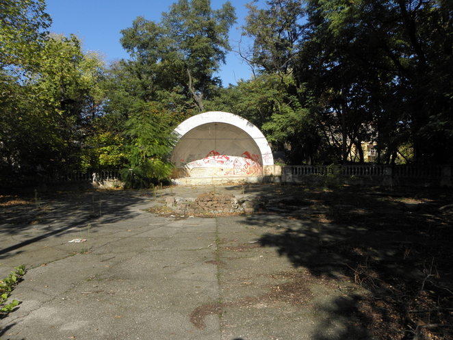 Сама площадка поросла бурьянами. На ней валяется немого мусора  и несколько крупных веток от деревьев. Маленький помост и навес  покрыты граффити, а в каменном ограждении, обрамляющем площадку, кое-где в трещинах проросли сорняки.