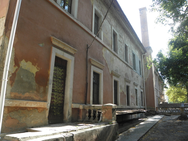 Если прямо у входа поднять голову вверх, то в потолке входного портика, который подпирают несколько колон с капителями, можно увидеть зияющую огромную дыру и торчащие из неё деревянные балки перекрытия, а сразу под ней – строительные леса. Это первое явное свидетельство аварийности здания. Уже после одного вида дыры напрягаешься:  что-то в любой момент может обвалиться тебе на голову. К тому же, под ногами валяются куски штукатурки и камни, подтверждающие такие догадки. Картину процесса разрушения подчеркивают трещины в наружных стенах, хаотически опутывающих здание.