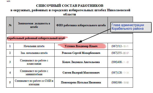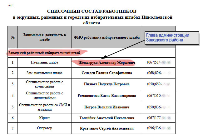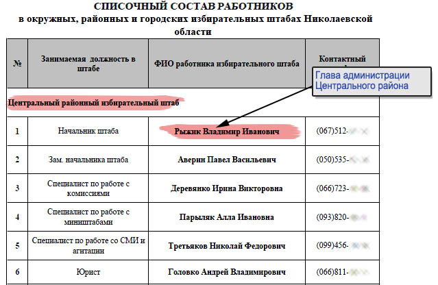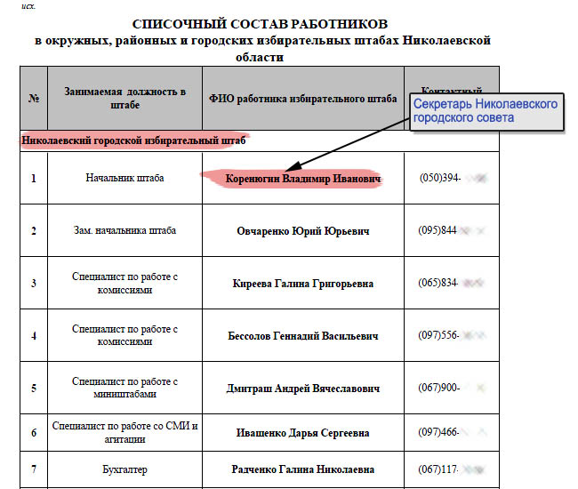 Позволю себе несколько побыть собакой, лающей вслед каравану, идущему по политическому и законодательному бездорожью, открыв читателям некоторые внутренние документы, а именно списочные составы работников николаевских избирательных штабов, полученные от надежных источников в Партии регионов. Из понятных соображений, личные мобильные телефоны штабистов были скрыты.