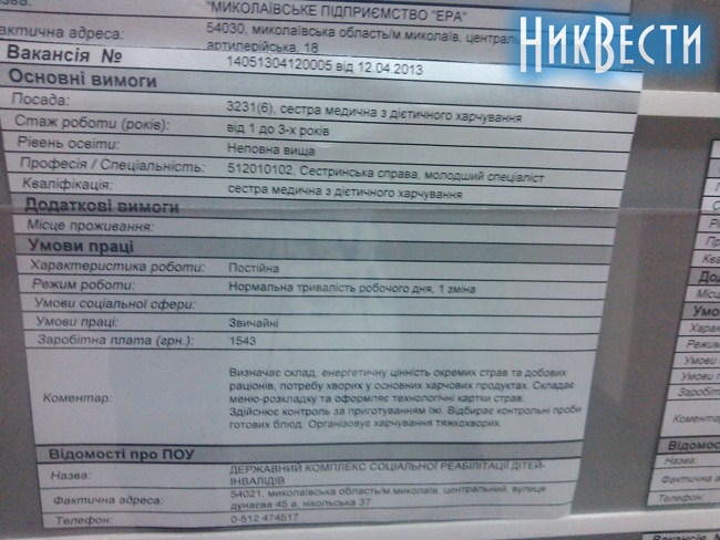 А госкомплекс реабилитации детей-инвалидов готов трудоустроить медсестру по диетическому питанию на полную ставку в 1543 гривны.