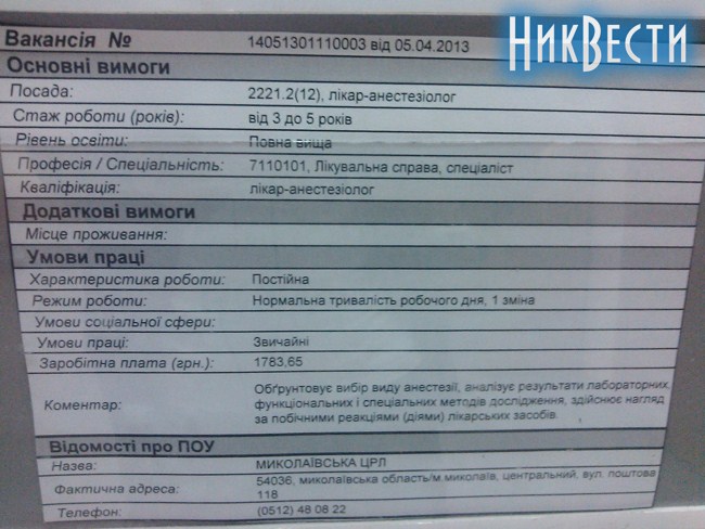 В ту же Николаевскую ЦРБ требуется врач-анестезиолог на постоянную форму работы и нормальный рабочий день. Зарплата - 1783 гривны 65 копеек в месяц.