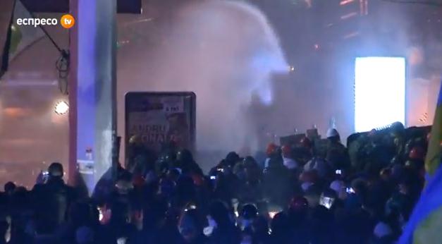 Из-за их спин подъехали три водомета, которые поливают баррикаду на Крещатике и активистов на ней. Они начали ломать баррикаду, несмотря на то, что на ней стояли люди. Силовики применяют свето-шумовые гранаты.