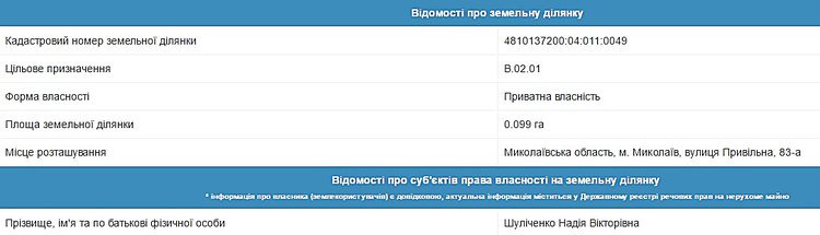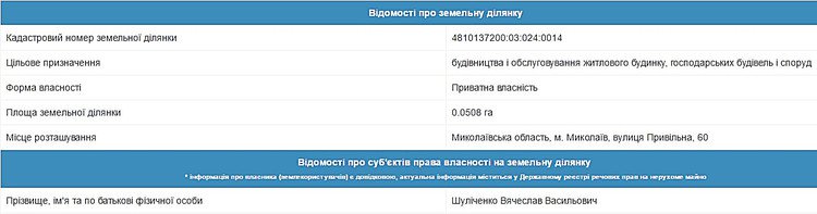 На этом список недвижимости семьи Шуличенко не окончен. На Надежду Викторовну оформлен также неработающий сегодня магазин-столовая с летней площадкой и погребом на Привольной, 41/1. Кроме того, семья директора николаевского КП по организации питания детей владеет еще двумя земельными участками в Херсонской области – в селе Львово на берегу Днепра Надежда Шуличенко в 2013 году купила домик, а в 2014 году и землю. В соседнем селе Ивановка на Вячеслава Шуличенко оформлено два земельных участка 11,5 соток и 2 сотки – тоже на берегу Днепра. А неподалеку, возле села Высокое на Татьяну Шуличенко записано 7,5 гектар сельскохозяйственной земли.