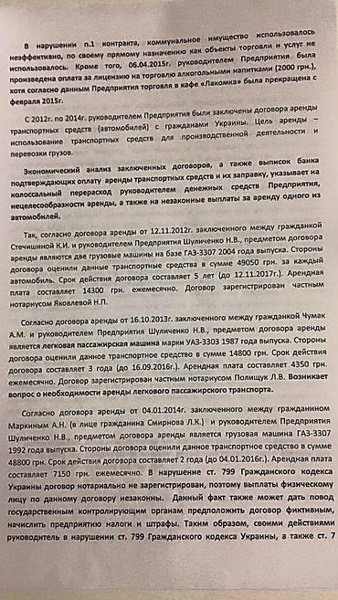 То есть за те деньги, которые в год Надежда Шуличенко тратит на аренду четырех автомобилей, можно было приобрести семь автомобилей ГАЗ-3307 2004 года выпуска, один ГАЗ-3307 1992 года выпуска, и три УАЗ-3303 1987 года выпуска. Купить, и больше не тратить деньги на их аренду. А если взять в расчет то, что договора подписаны на 2,3 и 5 лет, то, представляете, какой можно было автопарк коммунальному предприятию сколотить. Или же на сэкономленные деньги повысить зарплату работникам КОПа, получающим сегодня в среднем 1,5 тысячи гривен.