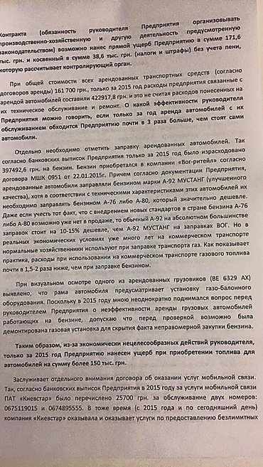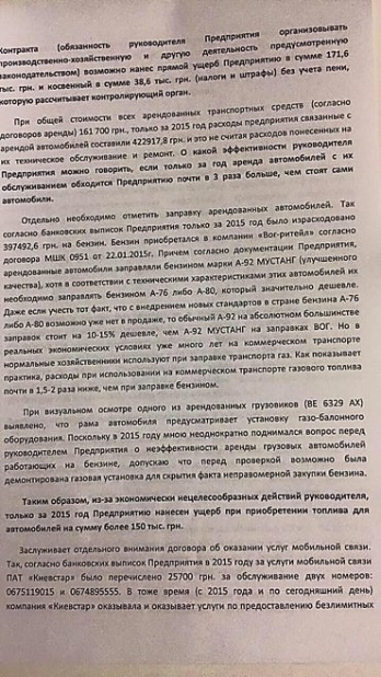 – Только за 2015 год было израсходовано 397 тысяч 492 гривен на бензин. Бензин приобретался у компании «WOG». Причем арендованные автомобили заправляли бензином марки А-92 Мустанг (улучшенного качества), хотя в соответствии с техническими характеристиками этих автомобилей их необходимо заправлять бензином А-76 или А-80, который значительно дешевле. Или даже обычные А-92 на абсолютном большинстве заправок стоит на 10-15% дешевле, чем А-92 Мустанг на заправках «WOG», – пишет мэру его заместитель Юрий Степанец.
