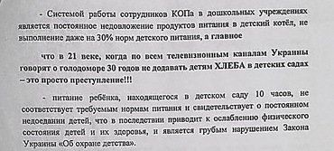 Ну и самое, на мой взгляд, главное из выводов проверки в 2013 году: «Объем порций очень мал. Питание ребенка, находящегося в детском саду 10 часов, не соответствует требуемым нормам и свидетельствует о постоянном недоедании детей, что, в последствии, приводит к ослаблению физического состояния детей и их здоровья и является грубым нарушением Закона Украины «Об охране детства».
