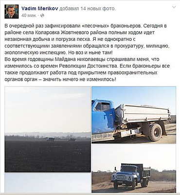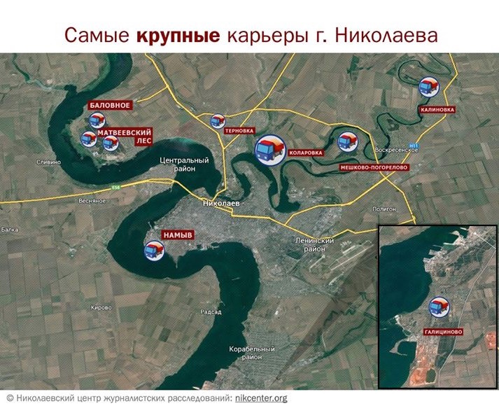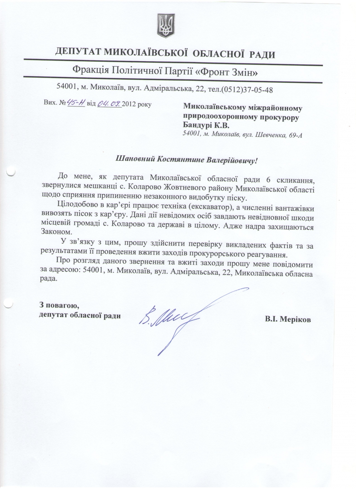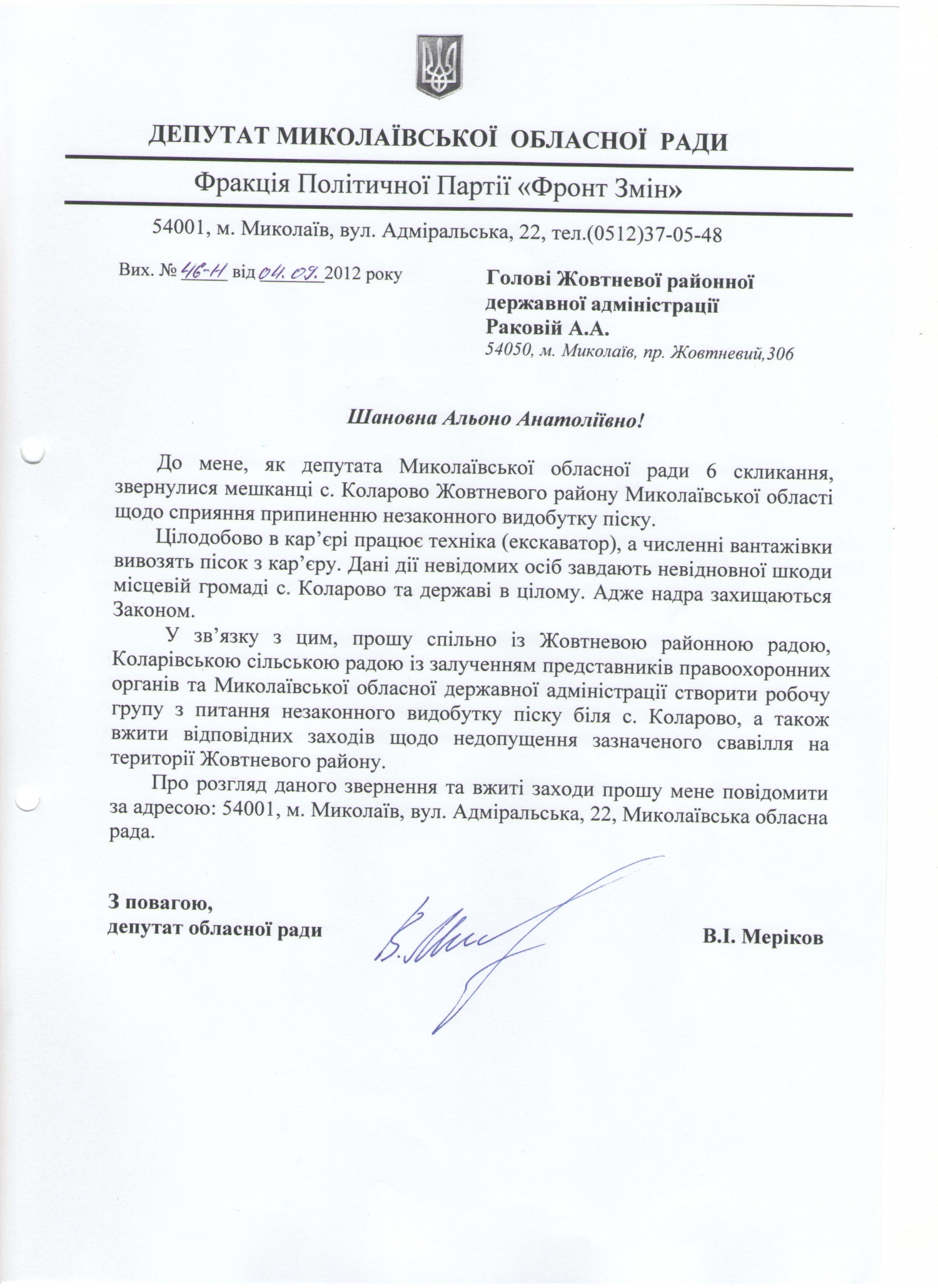 Если обратить внимание на ситуацию вокруг Коларовского карьера (Жовтневый район), то в 2012 году на имя депутата Николаевского областного совета В.Мерикова и депутатов фракции «Фронт Змін» было направлено обращение от жителей с. Коларово с просьбой препятствовать разграблению природных ресурсов, а именно добычи песка.
