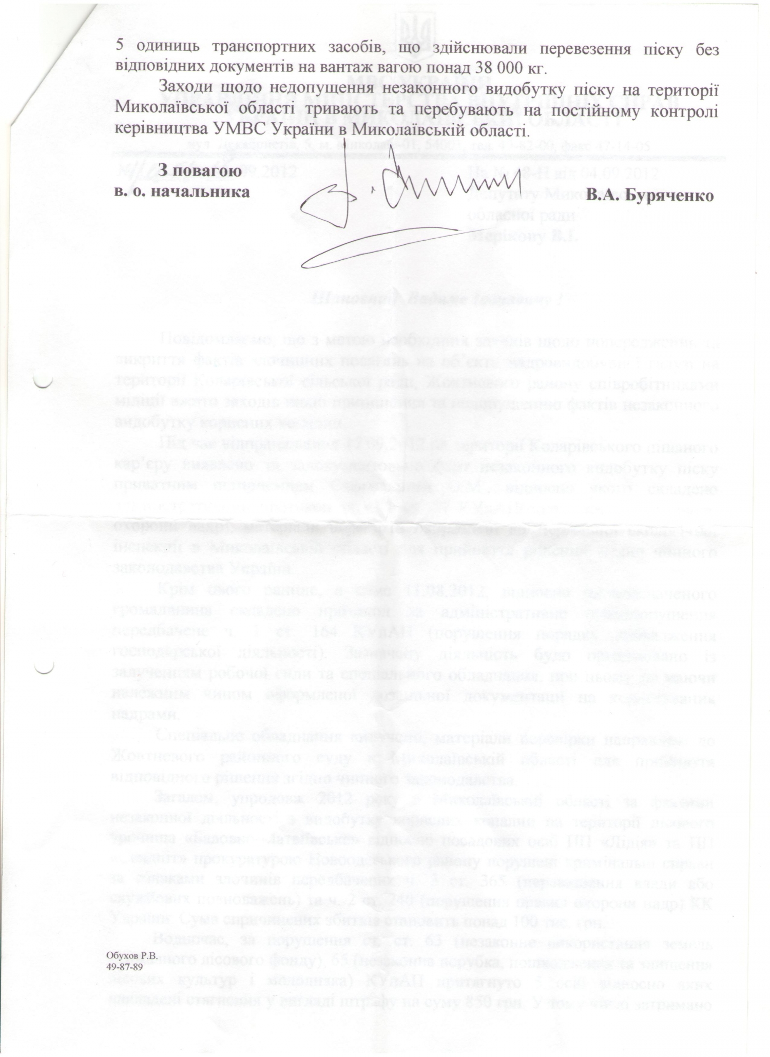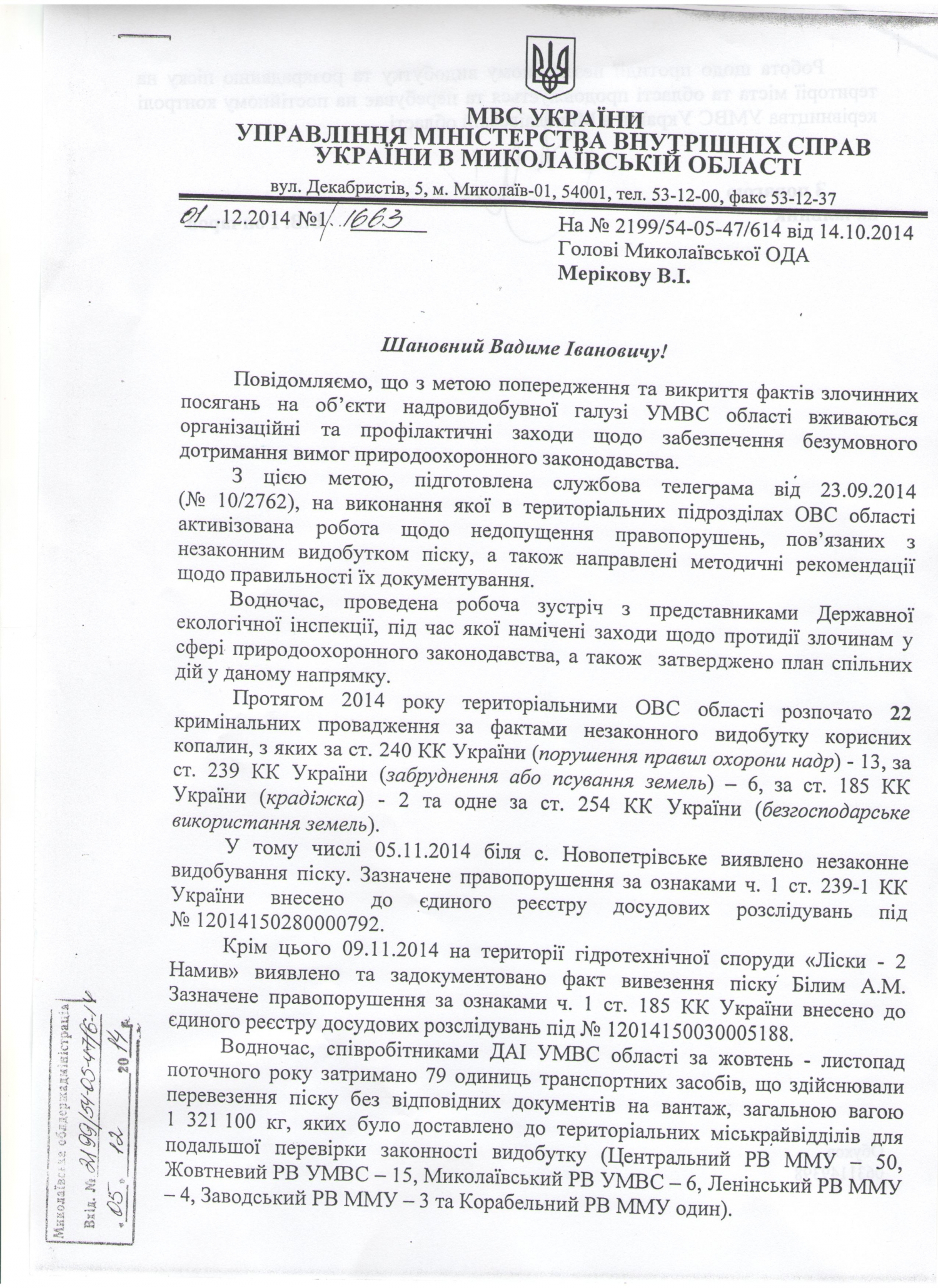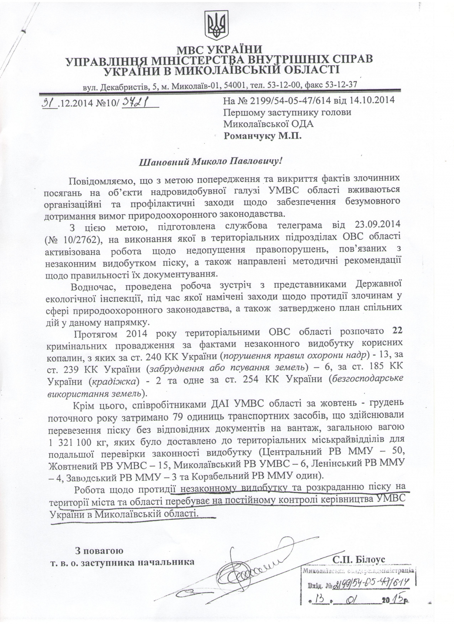 Как говорится: говоришь А говори и Б. В ноябре 2014 года, уже будучи главой Николаевской ОГА В. Мериков заявил, о том, что обратился к правоохранительным органам относительно «песчаных браконьеров», о дальнейших результатах рассмотрений этих обращений публично не заявлялось, исправляю данную оплошность: 31 декабря 2014 был получен сводный отчет о том, что территориальными ОВД области открыто 22 уголовных производства по фактам незаконной добычи полезных ископаемых, из которых по ст. 240 УК Украины (нарушение охраны недр) – 13, по ст. 239 УК Украины (загрязнения или порча земель) – 6, по ст. 185 УК Украины (кража) – 2 и одно по ст. 254 УК Украины (бесхозяйственное использование земель). Насчет 2015 года буду держать на контроле.