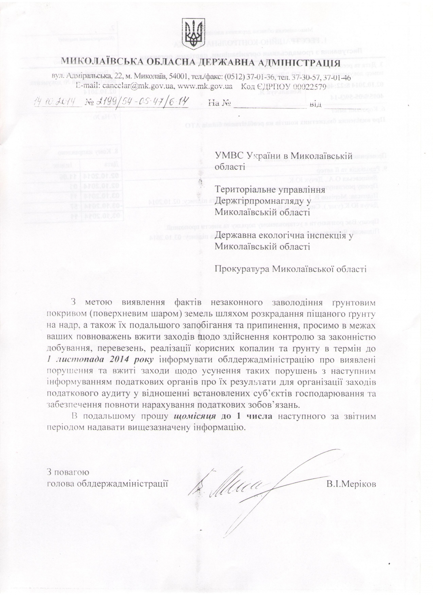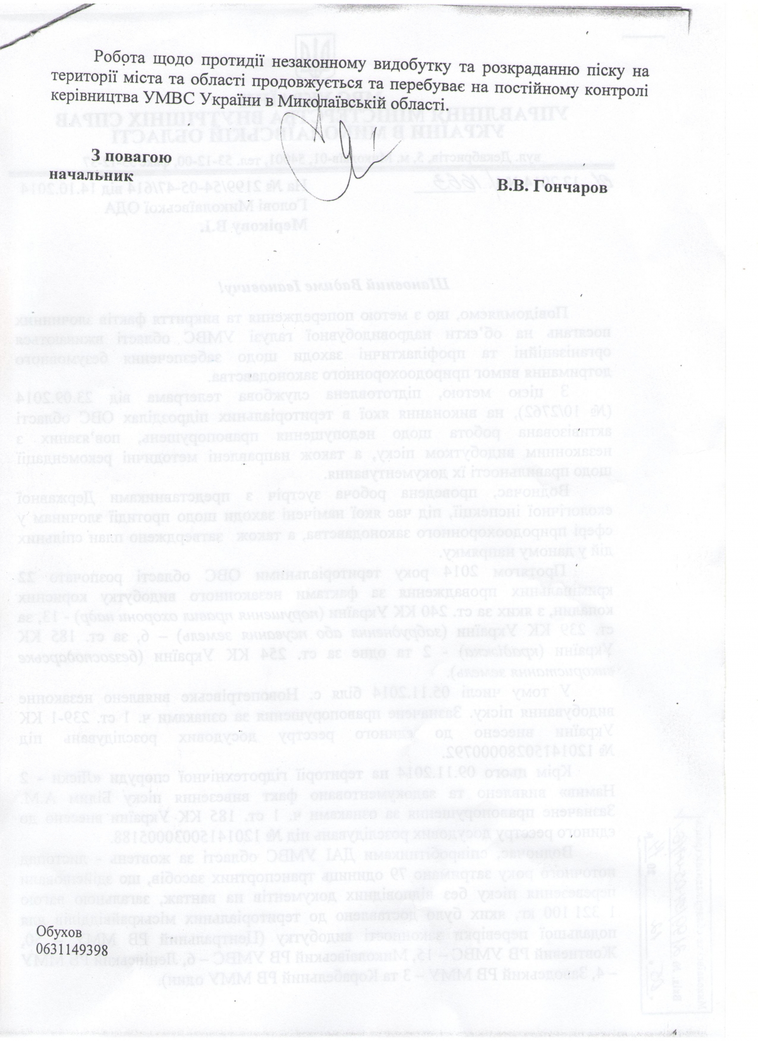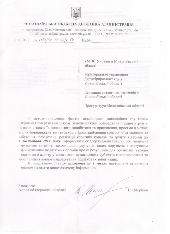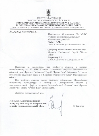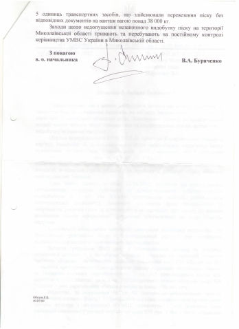Как говорится: говоришь А говори и Б. В ноябре 2014 года, уже будучи главой Николаевской ОГА В. Мериков заявил, о том, что обратился к правоохранительным органам относительно «песчаных браконьеров», о дальнейших результатах рассмотрений этих обращений публично не заявлялось, исправляю данную оплошность: 31 декабря 2014 был получен сводный отчет о том, что территориальными ОВД области открыто 22 уголовных производства по фактам незаконной добычи полезных ископаемых, из которых по ст. 240 УК Украины (нарушение охраны недр) – 13, по ст. 239 УК Украины (загрязнения или порча земель) – 6, по ст. 185 УК Украины (кража) – 2 и одно по ст. 254 УК Украины (бесхозяйственное использование земель). Насчет 2015 года буду держать на контроле.