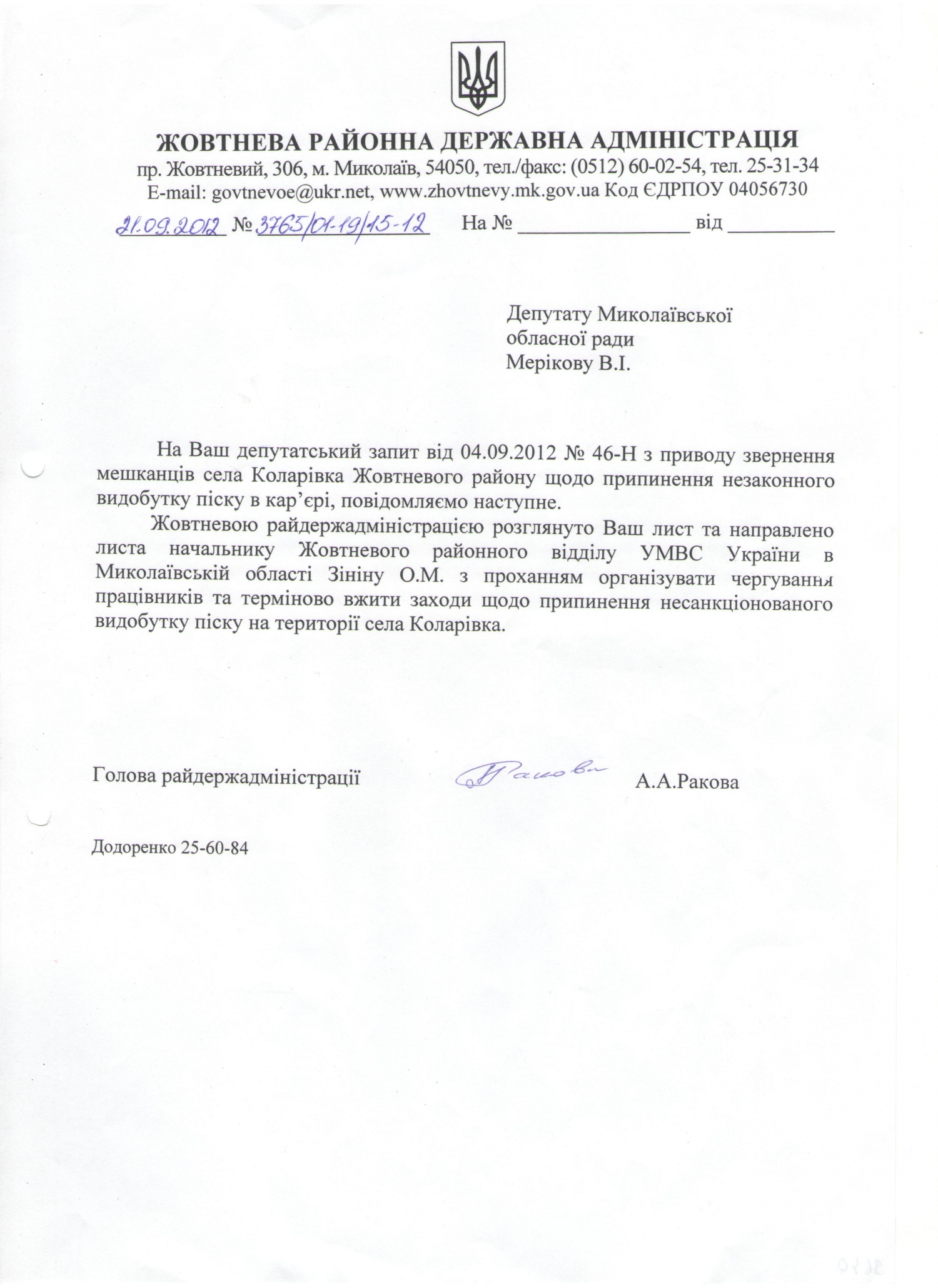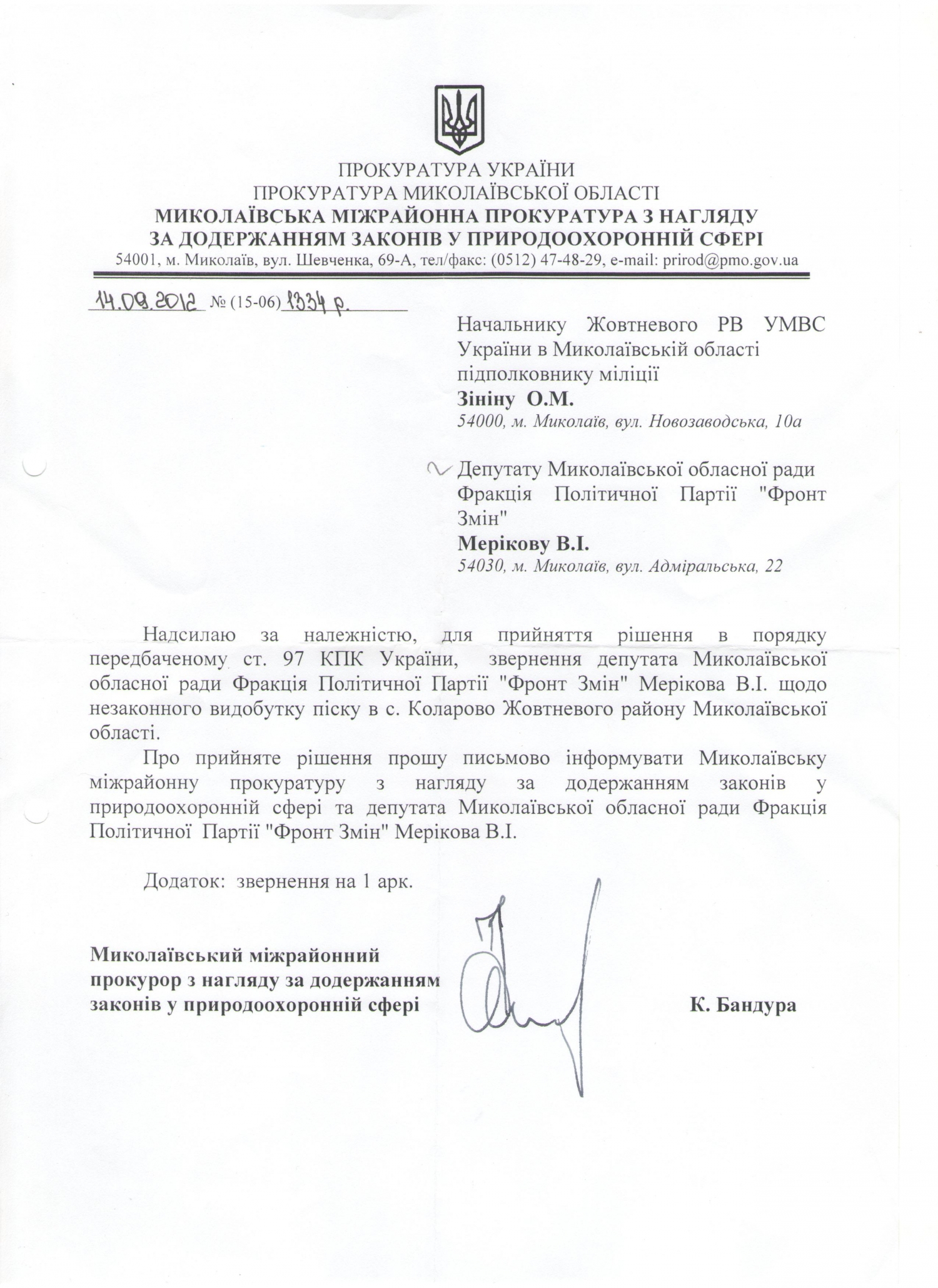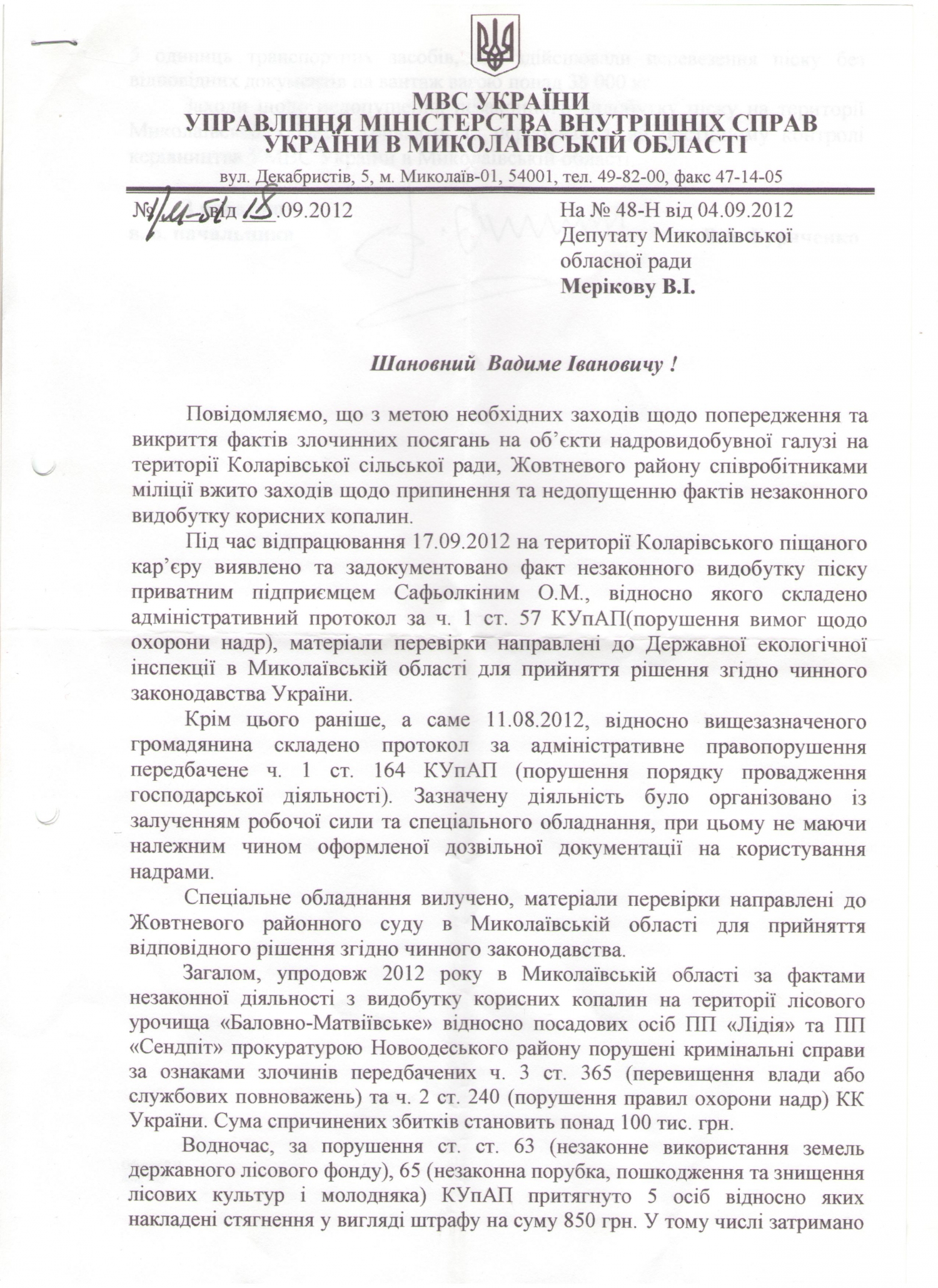 В сентябре 2012 года депутат Николаевского облсовета, а сейчас губернатор В.И. Мериков получил следующий ответ от УВД насчет «песочного браконьерства» (№1/м-51 от 18.09.2012), в котором основным фигурантом «Коларовского дела» был Сафелкин А.Н.. В отношении него был составлен админпротокол по ч.1 ст. 57 КУоАП (нарушение требования по охране недр) и т.д.